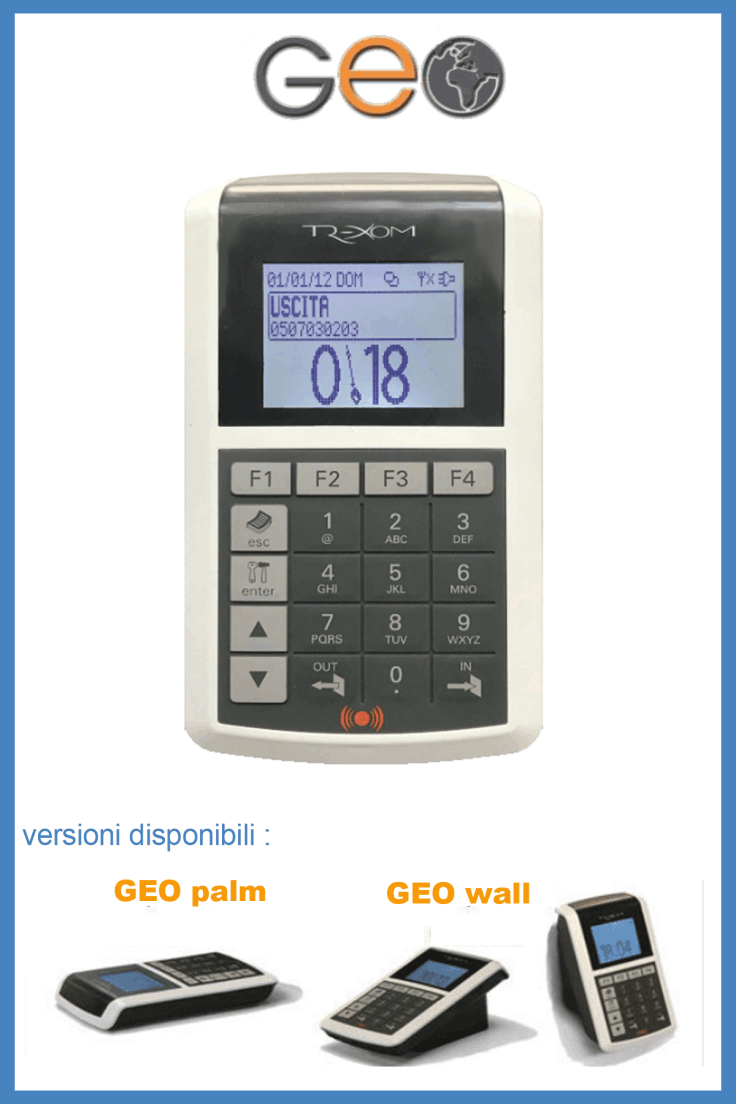 GEO è un terminale di raccolta dati unico, è basato su tecnologia ARM®, si può usare come terminale portatile, fissato a parete, installato su tornelli, per controllo accessi, gestione presenze, controllo attività itineranti, … GEO è uno strumento semplice da utilizzare, affidabile nel tempo e completo nelle prestazioni. Consente moltissime possibilità di configurazione e personalizzazione. È possibile costruire “su misura” il terminale in funzione delle richieste del cliente. Questo tipo di ingegnerizzazione lascia la strada aperta a futuri sviluppi e implementazioni, caratteristica vincente in un mercato sempre più competitivo che richiede soluzioni sempre più professionali e mirate.